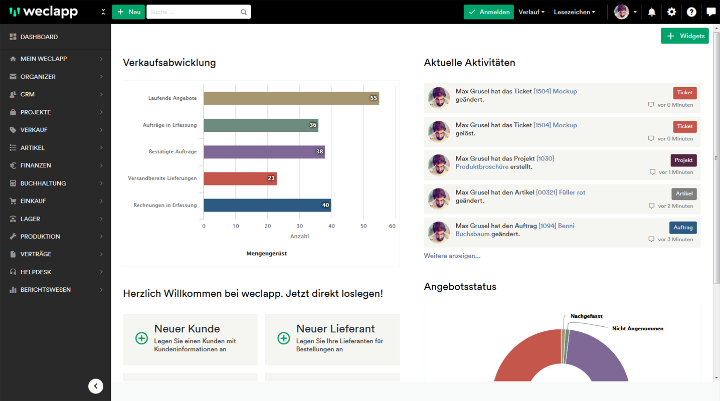 Folgender Screenshot zeigt das Dashboard von weclapp, welches frei konfigurierbar ist, sodass sich jeder User, je nach Rolle im Unternehmen oder Aufgabenbereich, die Widgets individuell anlegen kann. Die Mitarbeiter können sich dabei offene Angebote, den Auftragsstatus, Warenbestände, etc. anzeigen lassen. Im Sidebar-Menü sind die Module bzw. Unternehmensbereiche sichtbar, die die ERP-Software unterstützt.